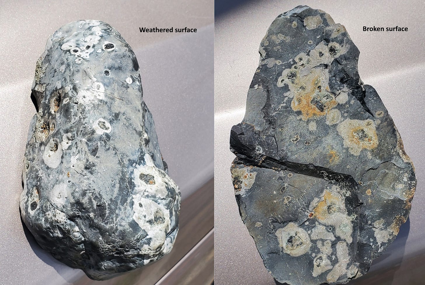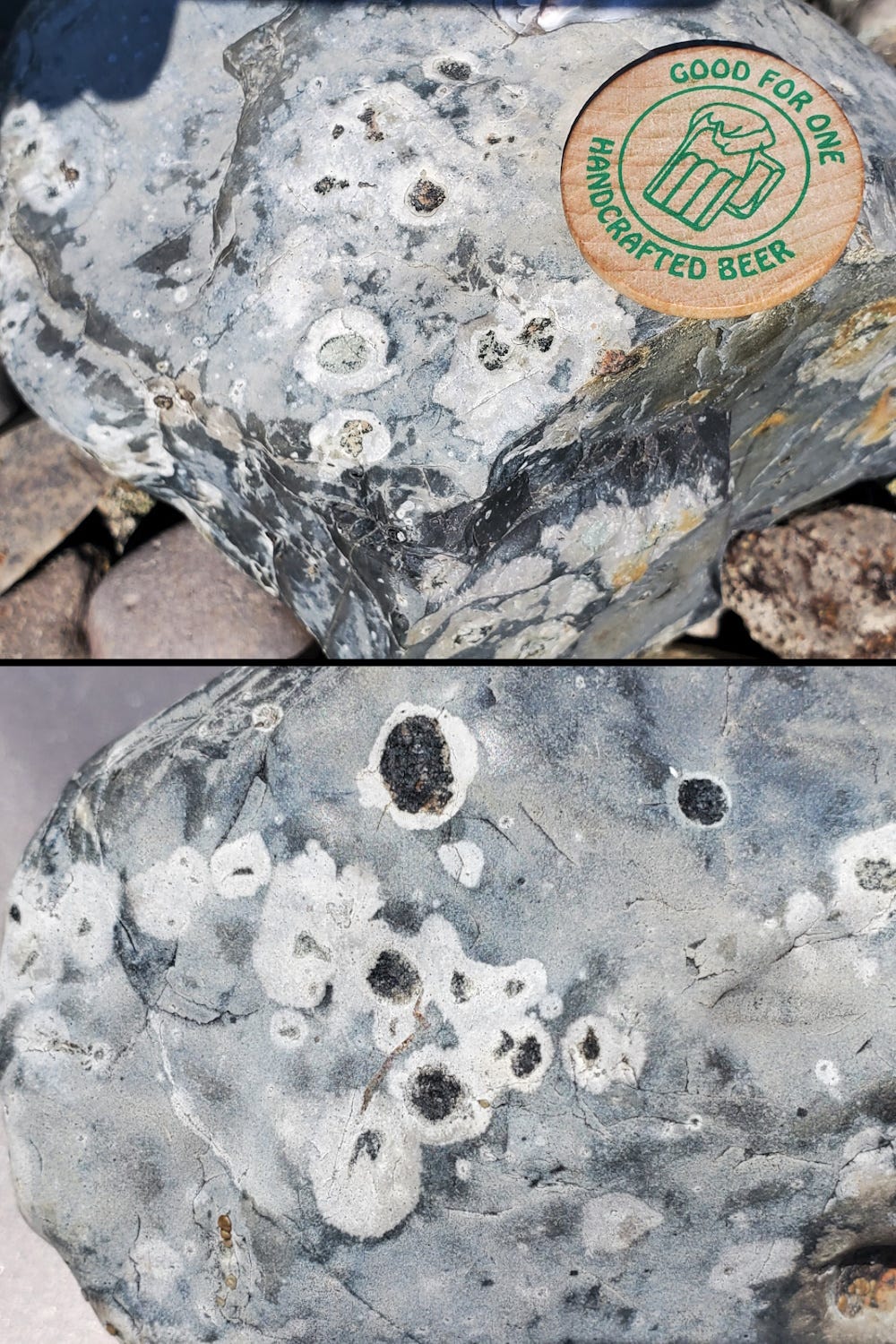 This leprous looking thing is a cobble from Silver Bow Creek south of Gregson Station near Fairmont, Montana USA, that’s about 15 cm long. The enigmatic part is the round white blobs with cores of a dark mineral. They go into the rock and are not just on the surface.