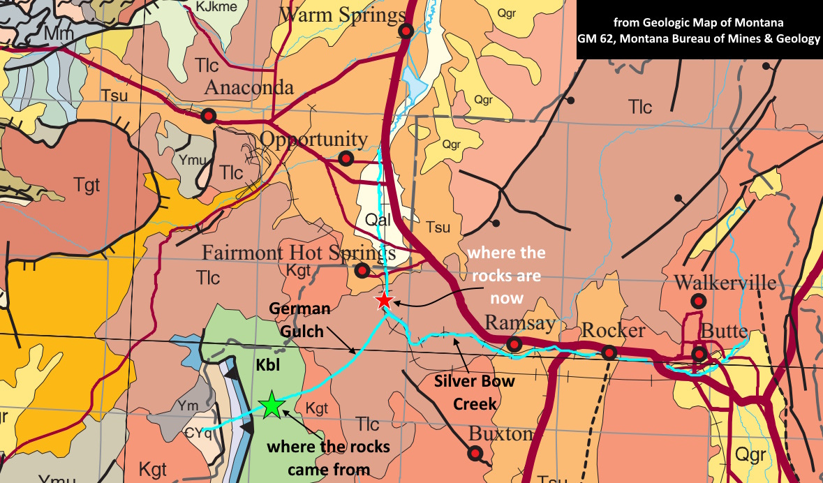 Upstream on Silver Bow Creek the only rocks the stream could have eroded are either Butte Granite or Lowland Creek Volcanics, and this is neither of those. But the location is just downstream from the mouth of German Gulch, and German Gulch drains a complex, highly mineralized and metamorphosed terrain including sedimentary and metasedimentary rocks ranging in age at least from Cambrian to Cretaceous, including about three kilometers of exposure of the Vaughn Member of the Cretaceous Blackleaf Formation (light green, Kbl on the map above; see also McDonald and others, 2012, Geologic map of the Butte South Quad, MBMG Open-File 622).