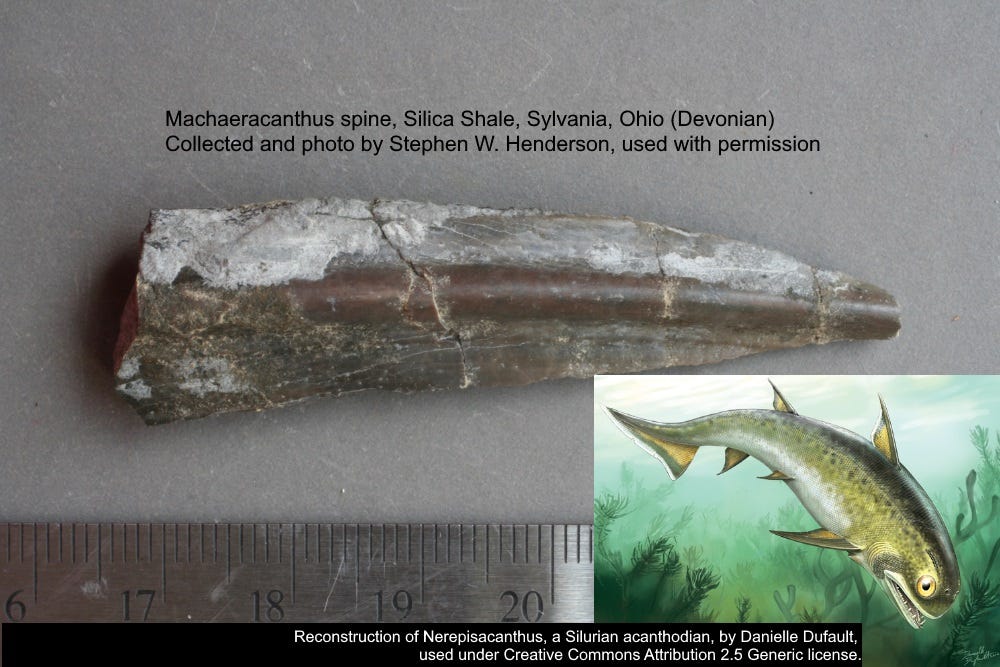 Acanthodians were among the first jawed fishes, sometimes called spiny sharks for the long, strong spines that supported their fins. The specimen in the photo, from my friend Stephen Henderson, is one of the spines of a large acanthodian, Machaeracanthus, from Devonian rocks called the Silica formation of northwest Ohio. It is about 390,000,000 years old, and by most estimates the entire fish would have been at most a meter long.