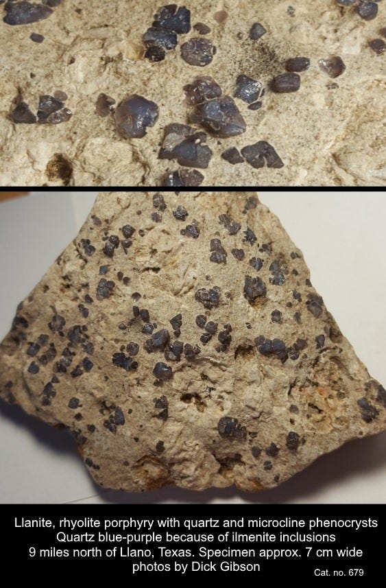 The phenocrysts (“showing” or “visible” crystals) of blue quartz in the llanite are supposed to be “beta quartz,” a high-temperature, higher symmetry form of quartz that can crystallize only above 573°C. In fact, it cannot even exist at surface conditions and pressures, so all “beta quartz” is actually a pseudomorph (“false form”) of regular quartz that has formed as the original beta quartz cooled but retained the crystallography of the beta quartz.