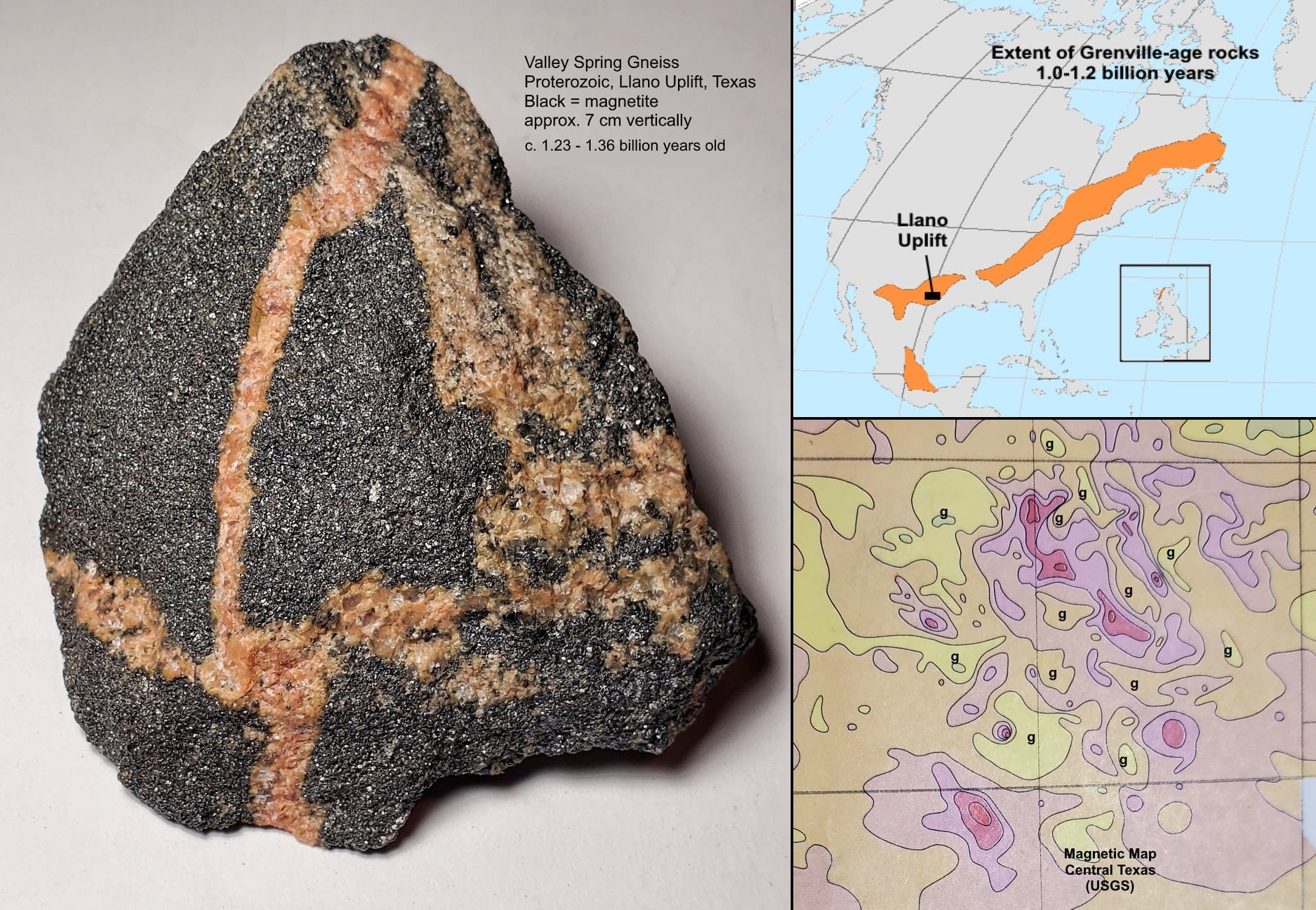 Besides making for nice specimens of magnetite, another consequence of all this is that the aeromagnetic map of central Texas shows magnetic lows where the granitic bodies intrude versus magnetic highs where the magnetite-rich Valley Spring Gneiss is present. In the magnetic map at lower right above, the “g” letters indicate where it would be most likely to find granite, either on the surface or in the subsurface. The red shades on that map probably correlate with locations of magnetite-rich Valley Spring Gneiss.