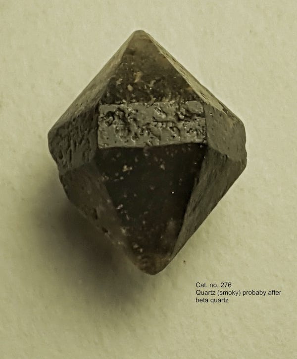 The little crystal above (not from Llano; probably from New York) is probably one such pseudomorph. Technically, since I knew you wanted even more jargon, it’s a paramorph rather than a pseudomorph, because while the crystal structure has changed, the chemistry has not. The essentially perfect hexagonal symmetry of this crystal marks it as a beta-quartz shape, versus the lower (trigonal) uneven symmetry typically displayed by normal quartz. It’s possible for normal trigonal quartz to have equally developed faces that appear fully hexagonal, but it’s unusual.