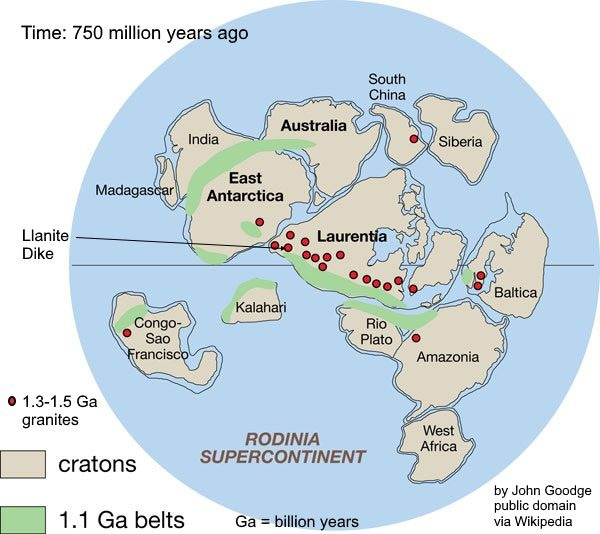 This reconstruction (others exist) shows Rodinia about 750 million years ago, just before it began to break up. “Rodinia” is from Russian for “motherland,” or “to give birth,” alluding to this continent’s early place in the rifting-collision cycles that have followed called Wilson Cycles with respect to ocean basins, for J. Tuzo Wilson. Even so, Rodinia was probably preceded by at least one earlier supercontinent, named Columbia.