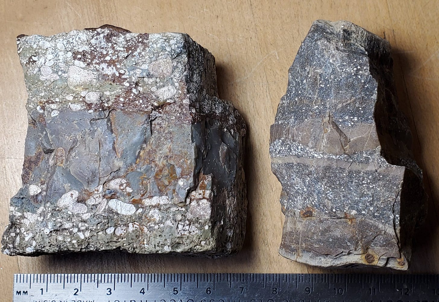 The thick beds of chert, chemically precipitated fine-grained silica, probably indicate the presence of abundant microorganisms like radiolarians that produced silicious shells plus siliceous sponge spicules, but given how much chert there is, there must have been a lot of them (Matheson and Frank, 2020, An epeiric glass ramp: Permian low-latitude neritic siliceous sponge colonization and its novel preservation (Phosphoria Rock Complex): Sedimentary Geology 399). Likewise, the white phosphate nodules, ooids, and beds – which are the mineral apatite, calcium phosphate – probably came from abundant life living in the cold waters, distant from sediment influx. The apatite would precipitate depending on the temperature-pressure conditions of the water, probably in water shallow enough for wave action to roll the grains around to produce the nodules, pellets, and ooids (from a word for “egg”). Alternatively, it might be possible that the round nodules and ooids represent reworking of more continuous or concretionary phosphate deposits (Zhang and others, 2021, Origin and evolution of the Late Cretaceous reworked phosphorite in the Sirhan-Turayf Basin, northern Saudi Arabia: Minerals 11(4), 350).