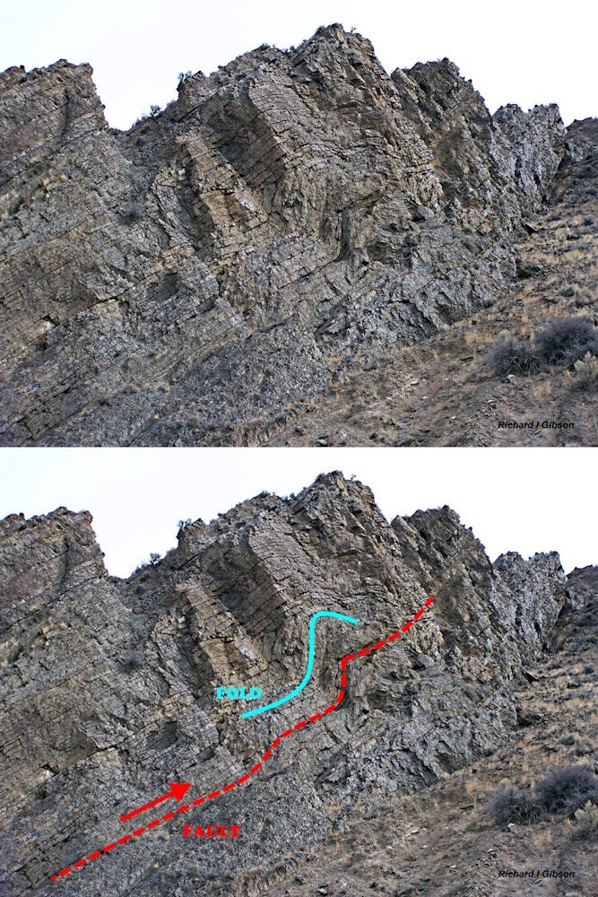 Since chert is fundamentally just dense silica, the mineral quartz, you might expect it to also break in a brittle manner. But the photo above, which is all bedded chert, shows how it can also fold under the right conditions. This is called a fault-bend fold, because the fold is a consequence (a bend) of the space problems created by a brittle break, a fault. The interpretation shows a simplified look; there are probably more faults (and small folds) in there than just one.