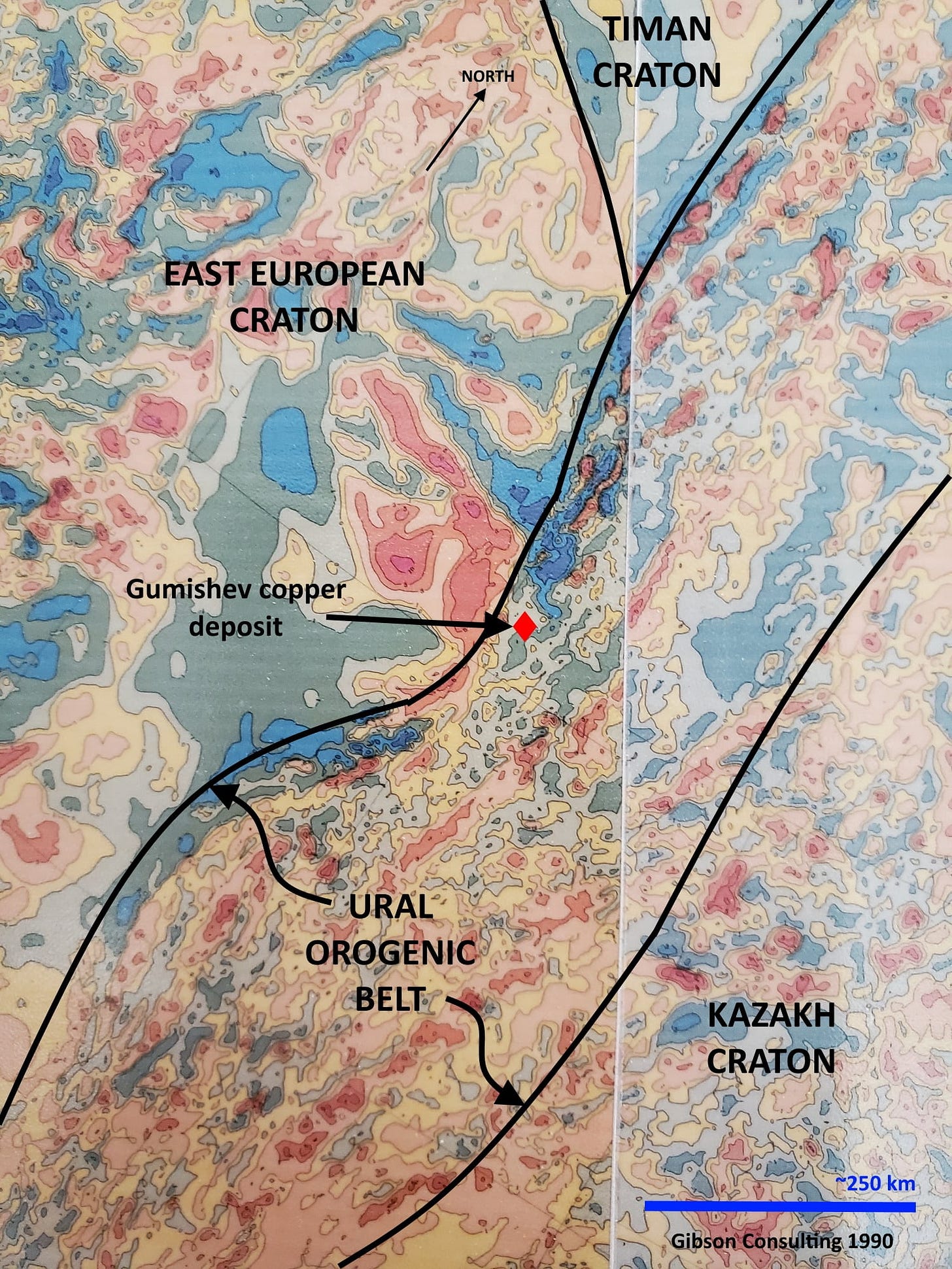 The magnetic map suggests the complexity of the Ural Mountains. Many of the linear red magnetic highs are probably ophiolites or bands of ultramafic intrusions. There’s no obvious correlation between the magnetic map character and the Gumishev deposit, but I’ve never tried to figure that out (my work on the magnetic map of the former Soviet Union was for oil exploration), and to do so would probably require data at a scale larger than this map, which is at 1:2,500,000.