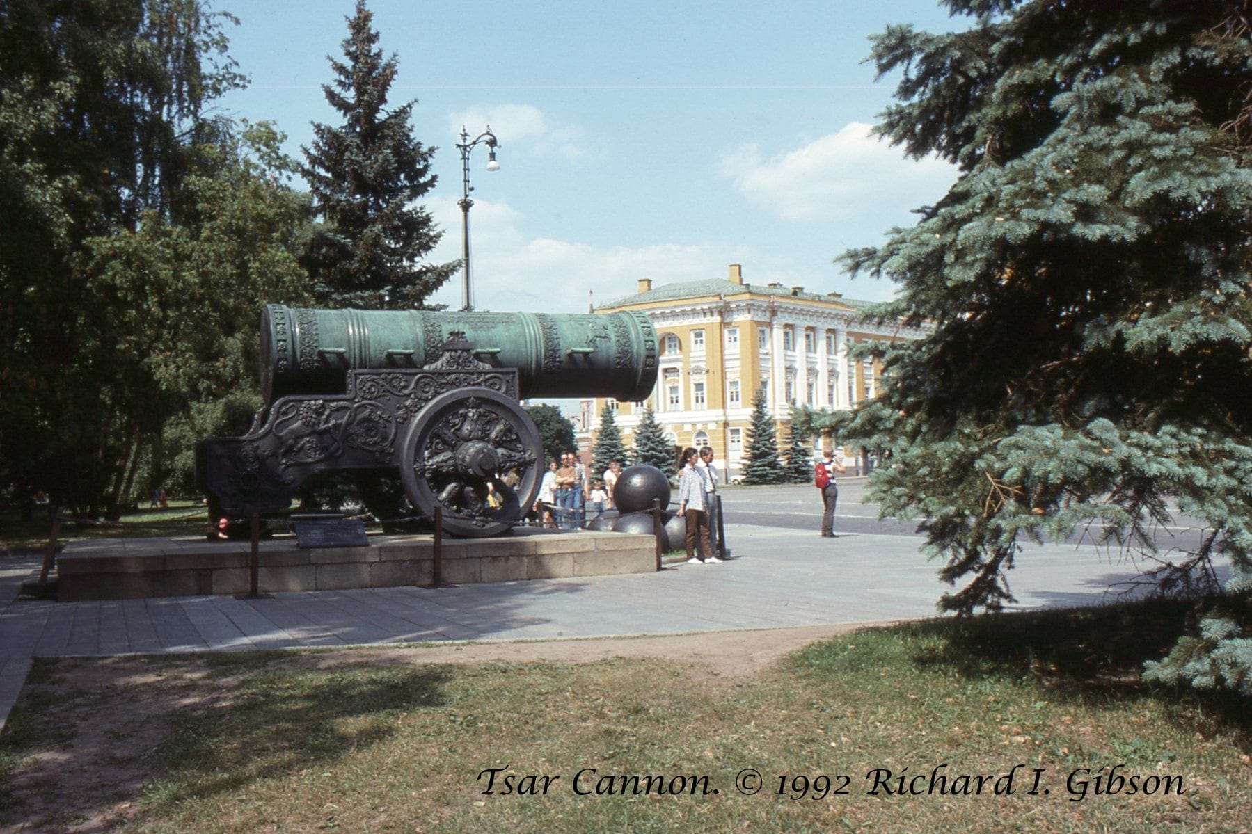 The Tsar Cannon photo is from my trip to Moscow in 1992 to participate in the conference of the Society of Exploration Geophysicists. Although the gun was made during the reign of Tsar Fyodor Ivanovich, the name is probably mostly a reference to its size. It was a symbolic item from its beginning; it may have been fired once, or never (the “cannon balls” in front of it are decorative and are too large to even fit in the gun). The yellow building in the background is the Kremlin Senate Palace, built in 1776-1787 to house the Imperial Russian judiciary and legislative organizations. Lenin lived in the building and parts of it were open for tours until 1994. Today it holds the offices of Russian leader Putin, and it is inaccessible to the public.