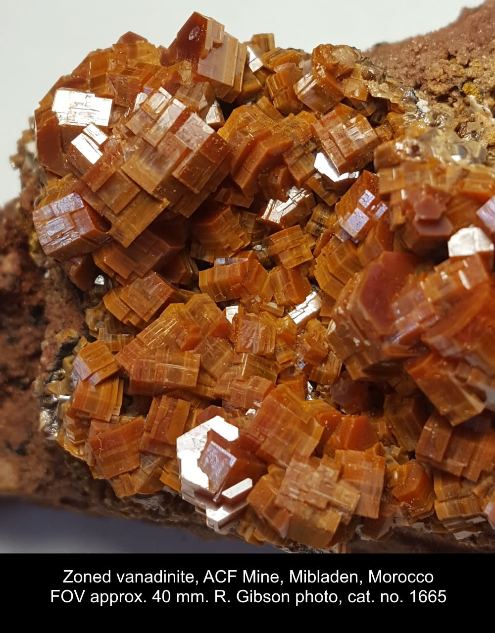 These spindles of vanadinite (a few with zoning), lead-vanadate-chloride, are from the Palomas Gap area (Dewey-White Swan Prospects), Caballo Mountain District, Sierra Co., New Mexico, USA. Vanadium prospects there are in low-temperature hydrothermal deposits in the Pennsylvanian Magdalena Formation limestone. The ore carried 0.5% vanadium pentoxide in 1944, which was non-economic (unreferenced statement on MinDat); today, the total volume is probably too small to be economic. The deposit may be related to the faulting that began about 25 or 30 million years ago and is continuing to create the Rio Grande Rift.