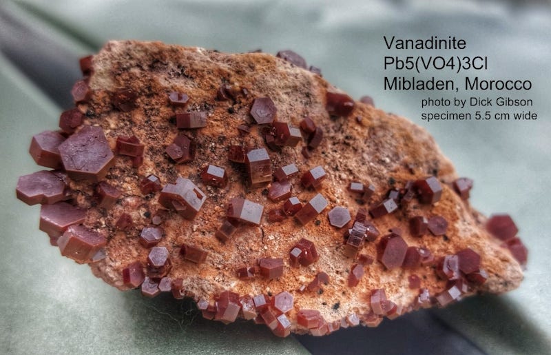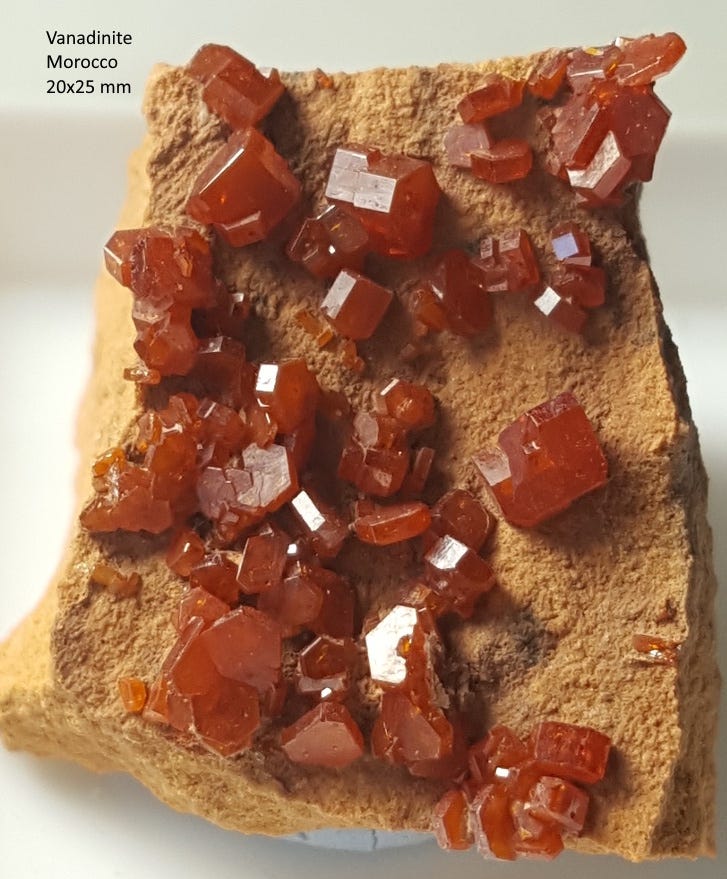 Although Morocco is not a significant player in the vanadium mining industry (although some areas are under evaluation), it is famous as a source of beautiful red vanadinite crystals prized by collectors; their abundance makes them typically quite affordable. Three examples are below.